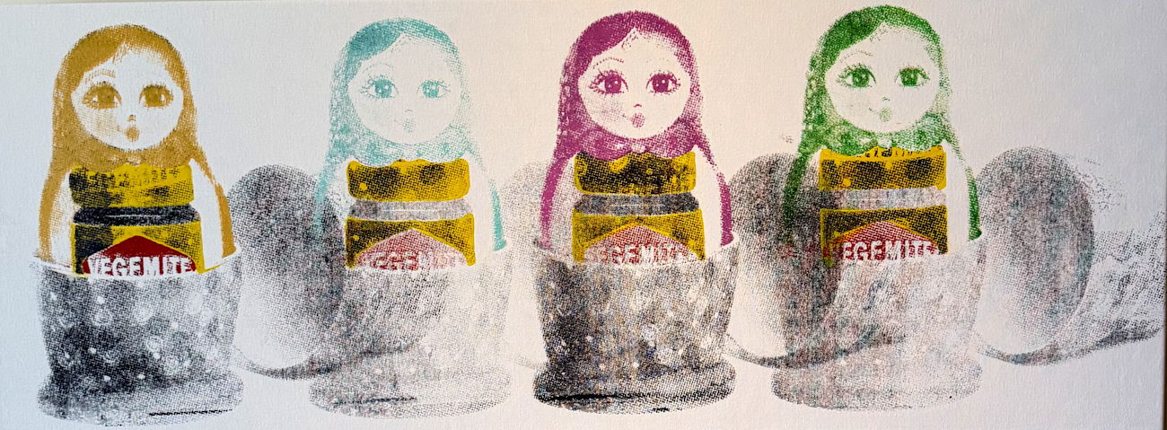 Описание: Данная работа критически осмысляет нестабильность национальной идентичности как культурно опосредованной и непрерывно переосмысляемой конструкции. Опираясь на формальную и символическую логику матрёшки - объекта, исторически связанного с идеями вложенности, множественности и внутренней иерархии, - повторяющиеся фигуры функционируют скорее как знаки многослойных субличностей, нежели фиксированных форм идентичности. Интеграция мотива Vegemite помещает эти формы в отчётливо австралийский семиотический контекст, создавая намеренное напряжение между унаследованной культурной памятью и заимствованной национальной символикой. Это пересечение акцентирует процессы культурного перехода, ассимиляции и дезориентации, в рамках которых идентичность предстает не как цельная, а как условная и конструируемая в постоянно изменяющихся контекстах. Фигуры, частично слитые с бытовыми символами, выдают амбивалентное положение между демонстрацией внешнего и сокрытием внутреннего. Повторение почти идентичных форм, различающихся лишь хроматически, дестабилизирует представления об индивидуальности, предлагая вместо этого серийность, воспроизводство и унифицированную природу «я» в современном обществе. На материальном уровне контраст между насыщенным цветом и исчезающим, почти призрачным изображением окружающей среды, вводит визуальный диссонанс, отражающий фрагментарность и ограниченность диаспорального опыта. Посредством повторения, двухмерного плоского объема и легкой деформации работа исследует, как культурная идентичность кодируется, трансформируется и переосмысляется в современном обществе, позиционируя её как постоянный и незавершённый процесс утраты, адаптации и воссоздания себя заново.